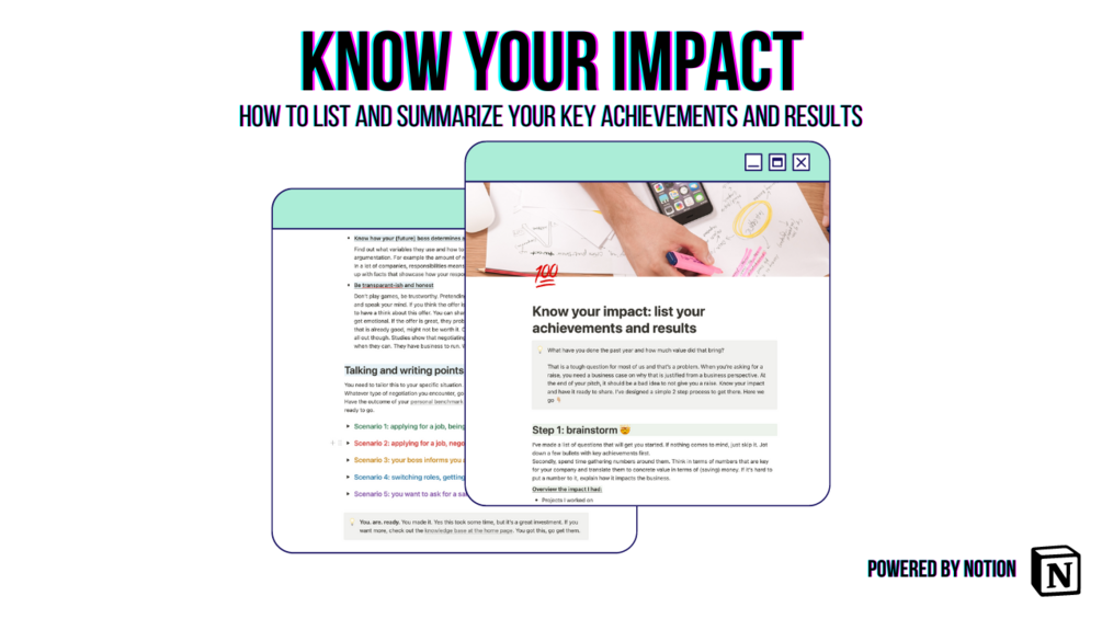 - Know your impact. A guide with exercises that will result in a powerful summary of your achievements and results. All with a strong focus on data. No more silence when your boss asks you why you deserve a raise.