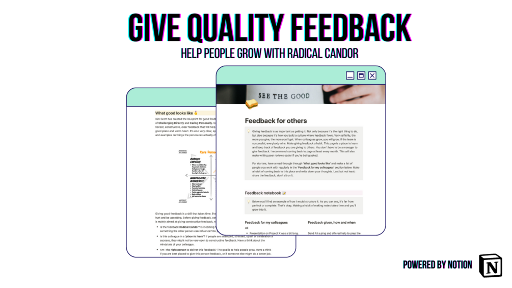 Feedback is the key to learning, improving and getting better personally and professionally. This Notion guide and template helps you to get all your feedback in one place, track it, reflect on it and actually grow. This template contains: